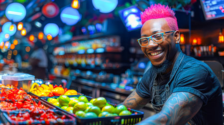 Joyful man showcases an array of fresh fruits in a lively market, illuminated by colorful lights and vibrant atmosphere.