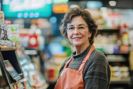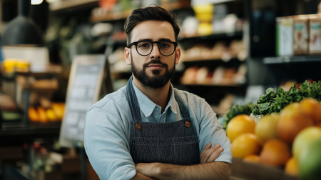 Elderly male shopkeeper, wearing apron and glasses, stands in grocery store aisle surrounded by vibrant products, creating a friendly shopping environment