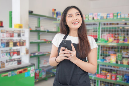 Asian female work as groceries store staff smiles and looks at the phone, wearing black apron while standing in front of display rack