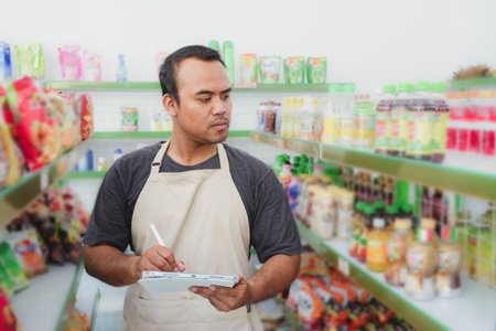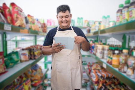 Happy Asian man as groceries or modren market staff checking products and goods on the display shelf while holding tablet and wearing grey apron