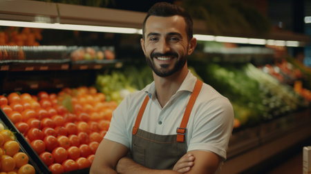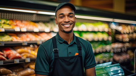 Portrait of Smiling young male supermarket worker. Generative Ai
