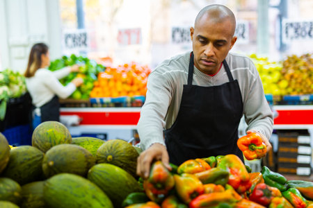Supermarket employee lays out bell peppers on shelves