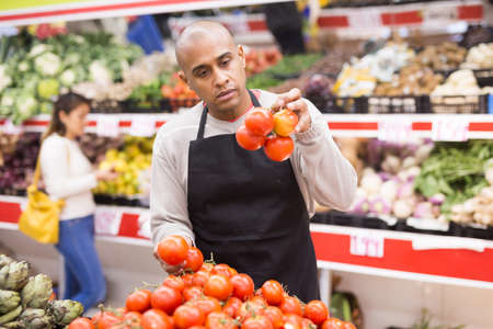 Seller lays out red tomatoes on supermarket counter