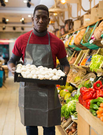 young male worker of big grocery supermarket