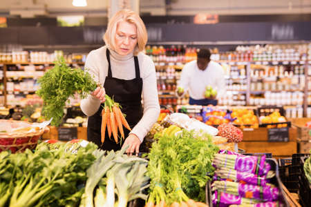 Experienced middle aged saleswoman working in organic food store, arranging fresh vegetables on counter