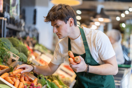 Guy salesperson in apron puts ripe carrot vegetables on display case