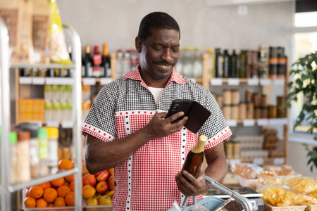 African man customer at shop scans QR code on beer bottle using phone camera