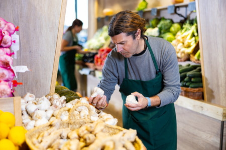 Adult male in apron selling garlic in greengrocer shop