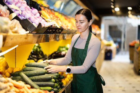 Middle-aged female seller putting cucumbers on counter in grocery market