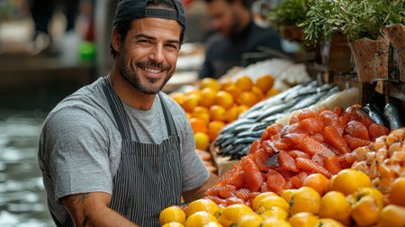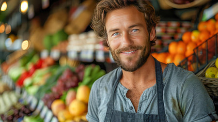Young man in an apron stands confidently in a vibrant market full of fresh produce on a sunny day