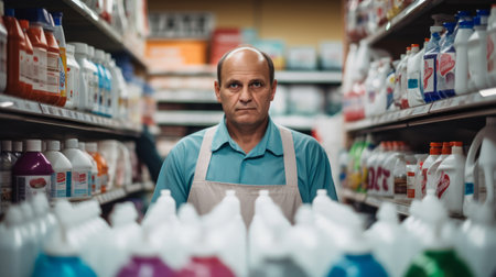 Laundry manager by detergent shelves exuding authority and organization