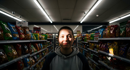 A portrait of a young man standing in a grocery store aisle with a variety of products in the background. The image captures a casual shopping moment with a focus on the consumer experience.
