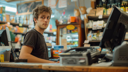 Young man working as a cashier in a small shop