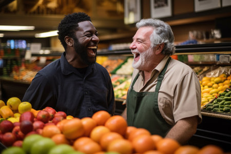 Friendly Exchange at the Fruit Stall: Warm laughter fills the air as an African American customer and an elderly man enjoy a pleasant conversation while shopping for fruits