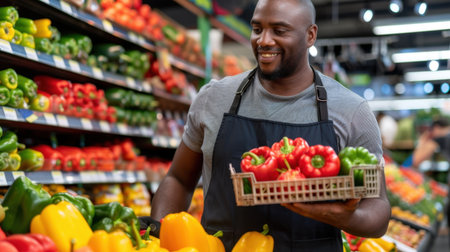 A joyful man in an apron selecting fresh bell peppers in a vibrant supermarket. The image captures a bustling produce aisle filled with colorful vegetables.
