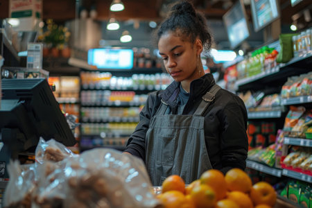 An African American female employee is working in the fruit and vegetable department of the store.