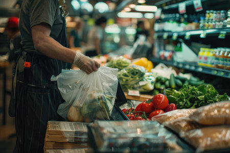 A man wearing an apron carefully selects fresh vegetables in a hypermarket.