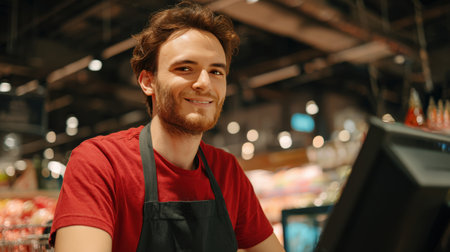 A young man with brown hair and a short beard, wearing a red shirt and black apron, smiles behind a cash register in a modern supermarket with warm ambient lighting.