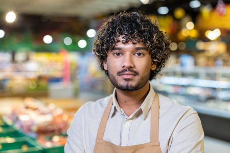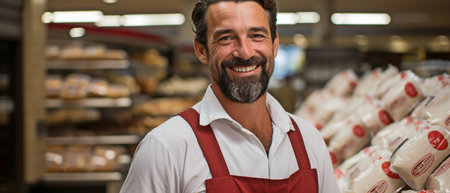 A portrait of a supermarket employee wearing an apron, looking directly at the camera.