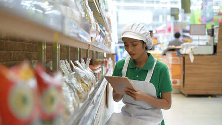 Smiling young Asian woman as a grocery store staffer checking goods supplies