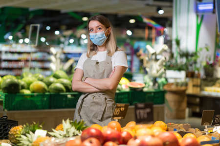 Portrait young woman worker seller in a Vegetable section supermarket standing in a protected face mask arms crossed. greengrocer female looking at camera in fruit shop market Employee in a work apron