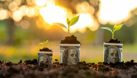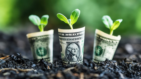 Dollar bills stand upright in soil, each with a small green plant growing from the top, representing the connection between money and sustainable growth in finance and investments.