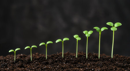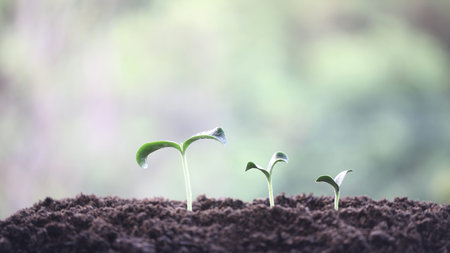 Image depicts the growth stages of young plants emerging from the soil, highlighting vibrant leaves and the process of natural development in a serene environment.