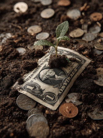 A seedling sprouts from a dollar bill nestled in soil, with scattered coins around. The close-up view highlights the textured earth and the details of the currency. The composition features a natural aesthetic with warm tones, potentially suitable for financial, economic, or investment-related editorial content.