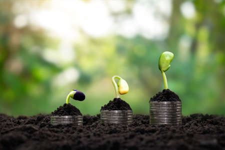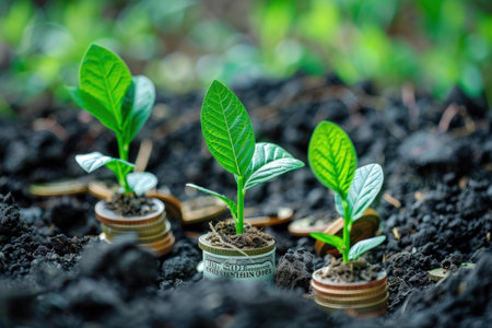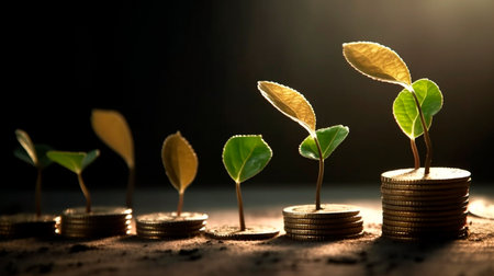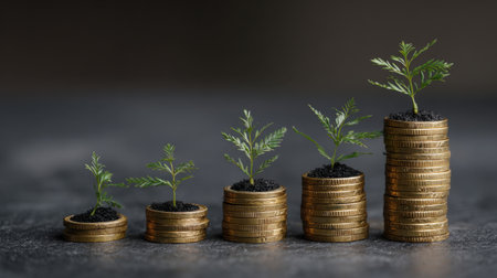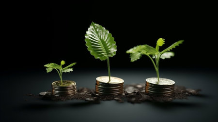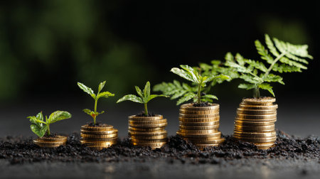 Growing plants on coins symbolize financial growth and investment. image showcases series of coins stacked with small green plants emerging from soil, representing prosperity and sustainability