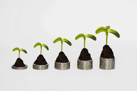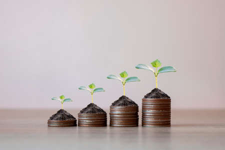 Coins arranged in stacks increase in height, with green plants emerging, symbolizing growth and business investment opportunities over time.