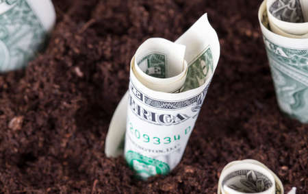 one-dollar cash bills planted in fertile land, the concept of business in agriculture