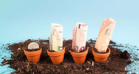 Euro banknotes in small flowerpots, money growing, financial planning, profitable investment, hope concept