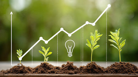 Several small green seedlings are planted in mounds of dark soil resting on a surface, with a superimposed white line graph demonstrating an upward trend across the sequence of plants, including an icon of a glowing lightbulb positioned above one of the middle plants, all set against a soft focus background of bright green foliage.