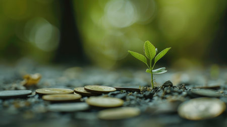 A vibrant sapling emerging from a coin on the ground, amidst other coins, symbolizing future growth and prosperity.