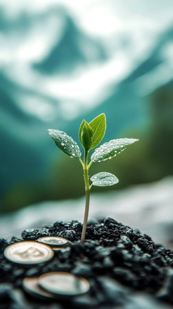 A vibrant green sprout emerges from a cluster of coins on a dark surface, highlighting the contrast between nature and wealth in a serene landscape.