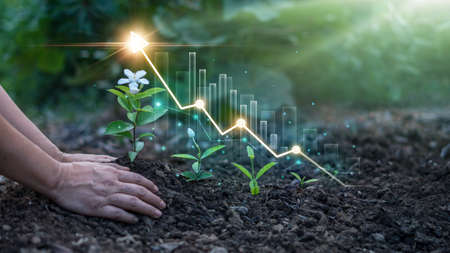 Hand plant a tree growing step and arrow graph business of growth and success in future. Business growth, development, profit and success.