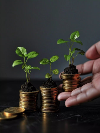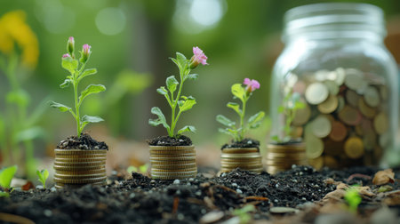Sustainable wealth concept: plants growing from orderly coin stacks, natural daylight, blurred savings jar in background