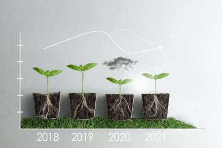 Business slump and recovery stages line graph, with seedlings and roots exposed