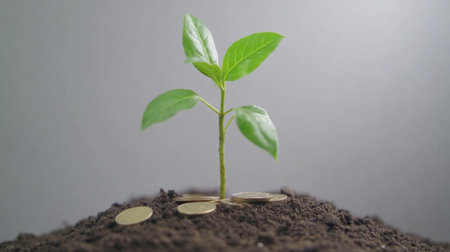 A young green plant emerges from dark soil alongside coins, symbolizing the intersection of nature and financial prosperity. This image showcases growth and investment potential.