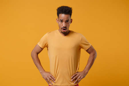 Shocked perplexed young african american guy in casual t-shirt posing isolated on yellow orange background in studio. People lifestyle concept. Mock up copy space. Standing with arms akimbo on waist.