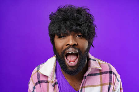 Young thrilled black man screaming on purple background