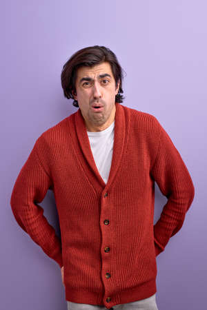 shocked man reacts on something incredible, isolated on purple background