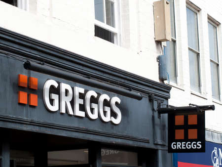 Greggs sign over premises, largest bakery chain in the United Kingdom, specialising in savoury products