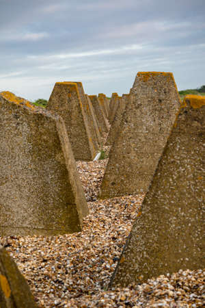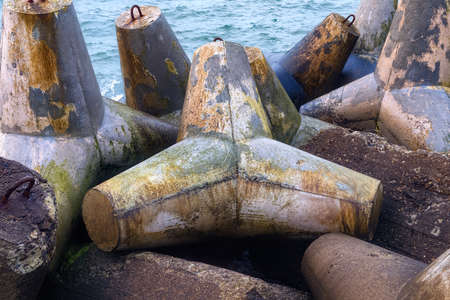Breakwater on beach. Ocean beach breakwaters. Old concrete blocks Campi.