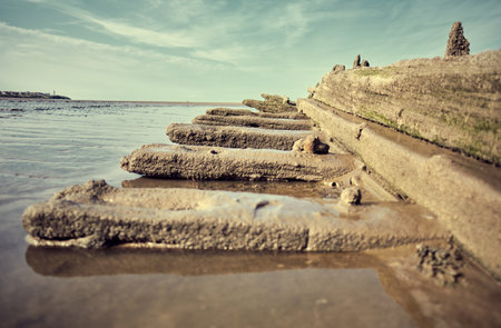 Beautiful landscape of coast of Baltic sea and old wooden breakwater at sunny cloudy morning