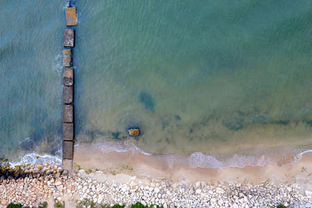 Aerial top view from drone to the seashore with old concrete pier