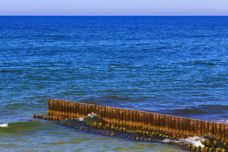 Embankment Zelenogradsk. Baltic Sea. Surf. Wooden logs of a breakwater. Kaliningrad