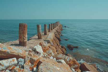 Captivating scene of a rugged coastline featuring weathered wooden posts standing against the backdrop of turbulent waves and a stormy sky.