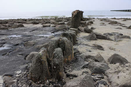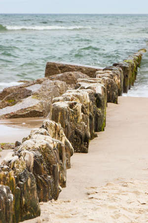 Breakwater on the beach of the Baltic Sea near Rewal in Poland