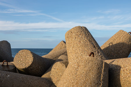 Massive concrete breakwaters with metal loops on the Baltic Sea shore in Wladyslawowo, Poland. Photographed in warm sunlight.